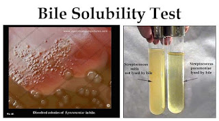 - · Bile solubility test: If a few drops of 10% sodium deoxycholate are added to 1 mL of an overnight broth culture, the culture clears due to lysis of cocci- due to an autolytic amidase that cleaves the bond between alanine and muramic acid in the peptidoglycan; Amidase is activated by bile salts